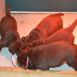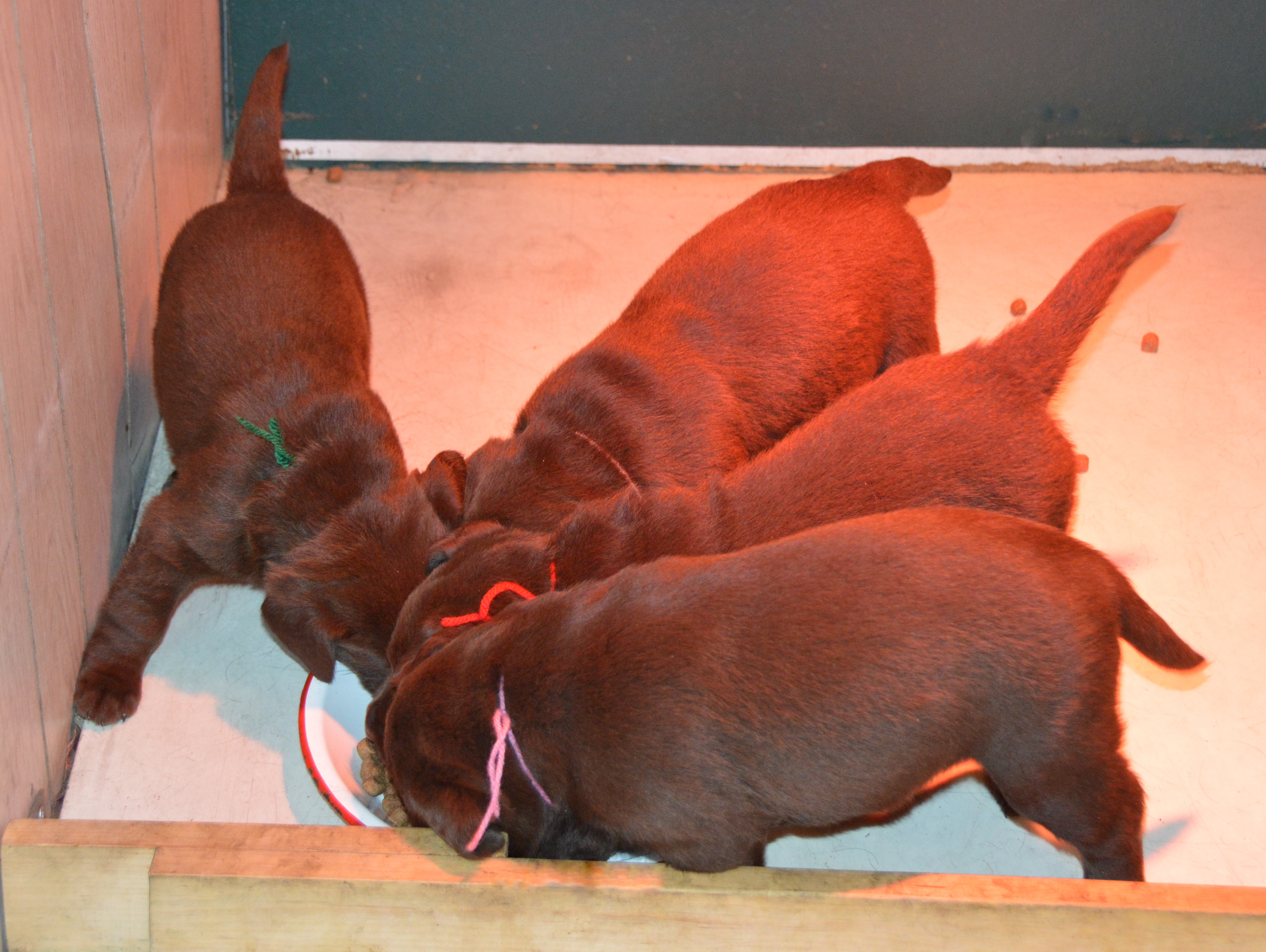 Here they are! Keisha’s puppies love to eat, play and sleep with the occasional little bark thrown in. They are fun to watch develop. The red and pink strings are the females and the boys are the other two. All have found wonderful families to welcome them to their homes just before Christmas. We are hoping to have puppies from Sunshine and Katie in the new year.