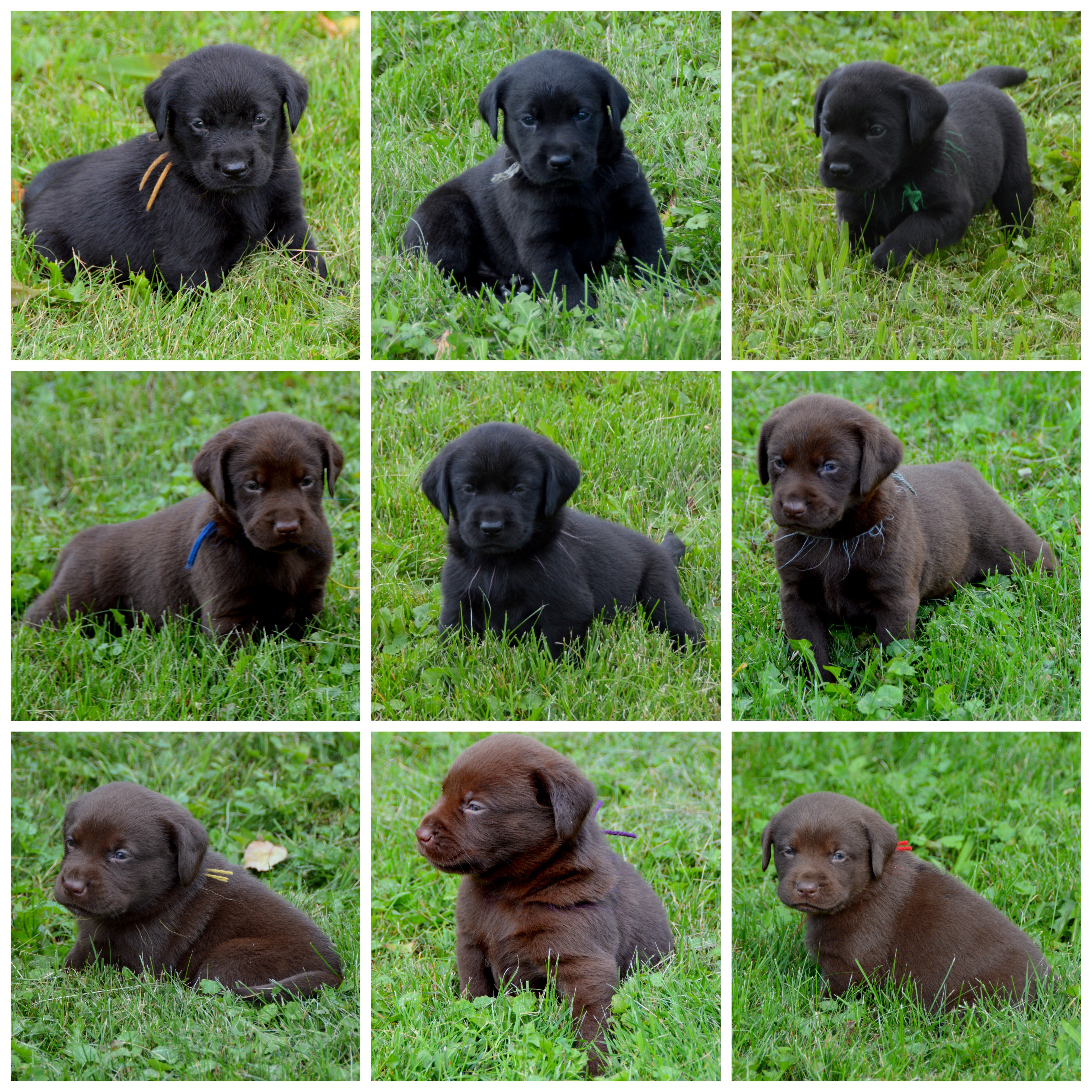 Kristy’s pups have new quarters and now can be out and about exploring a whole new world. They are starting to eat solid food and it is fun to watch their developing personalities. There are some black males and chocolate males and females available. We’ll keep you posted.