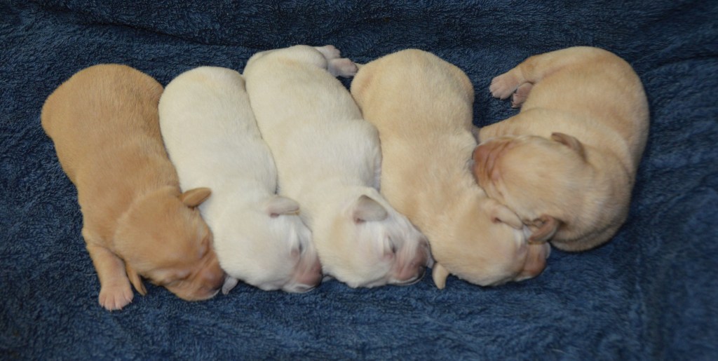 Crystal has 5 beautiful puppies. Just 5 days old and already almost double in size. We do seem to have difficulty getting the females we want and this litter is no exception. There is one female and I’m considering keeping her to replace her mom as a breeding female. The other 4 are all males. They will be ready for their new homes October 17. We’ll keep you posted.