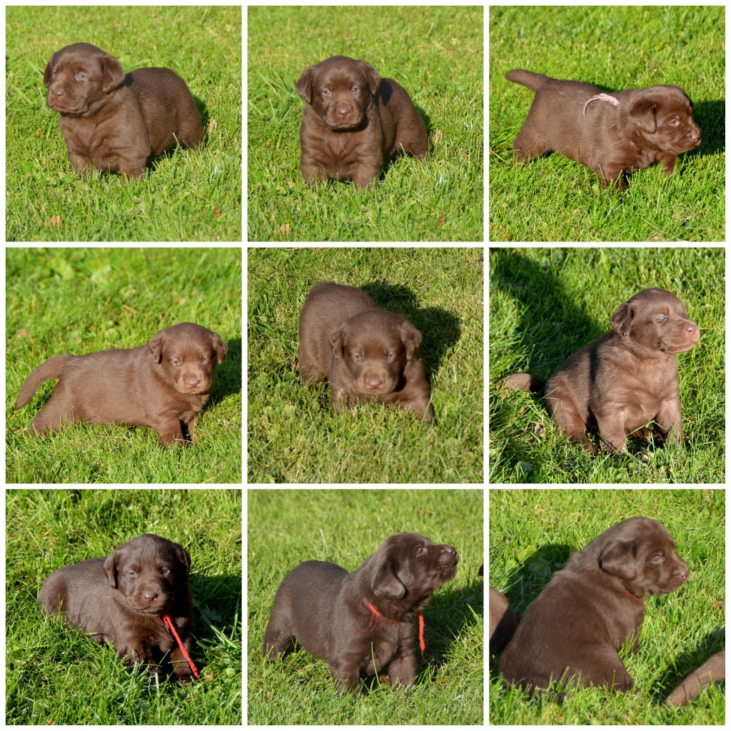 Kristy’s puppies have changed so much in the last week. It is amazing to see them start to explore their surroundings outside as well as inside – new sights, new smells and new sounds – so exciting! The puppies are starting to eat some solid food and it won’t be long before they will be tattooed, be vet checked, get their 1st shots and be ready for their new homes mid November. The collage of 9 are Kristy’s girls. The top row is the pup identified as Pink. The middle row has pictures of Yellow and the bottom row is Red.