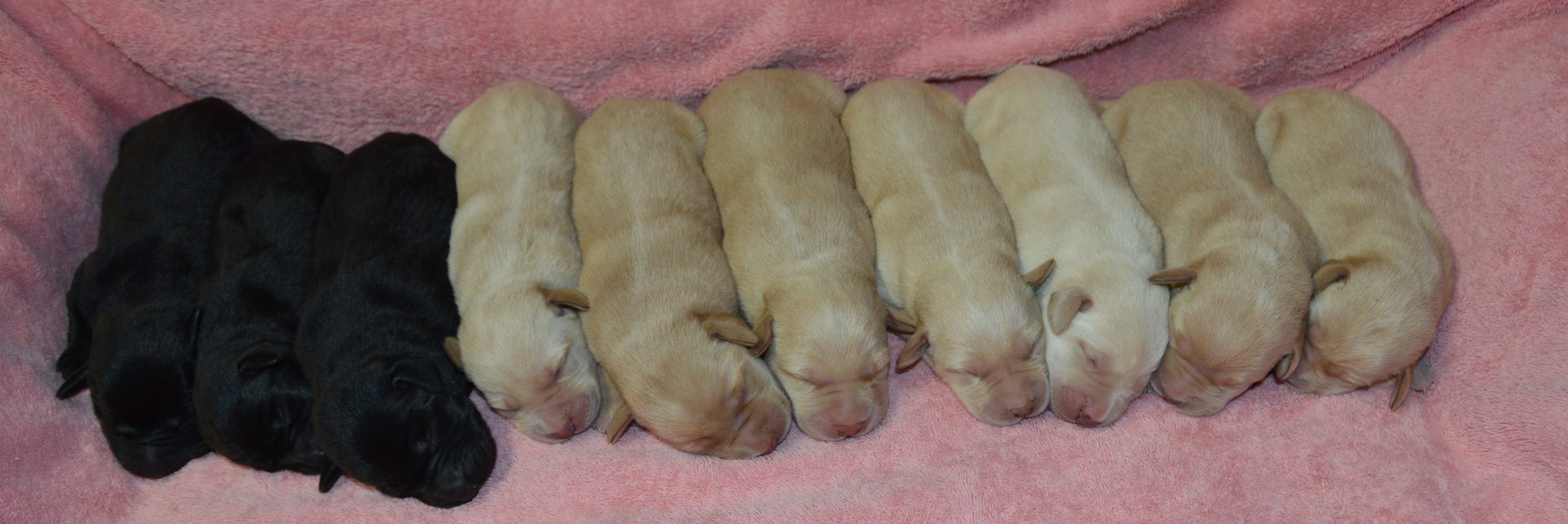 It is Ruby’s first litter, and what a great lot of puppies they are! There are 3 black males, on the left, with a single yellow male beside them, and the remaining 6, to the right are all lovely yellow females. They will be ready for their new homes May 12. There are both male and females presently available. We will keep you posted!